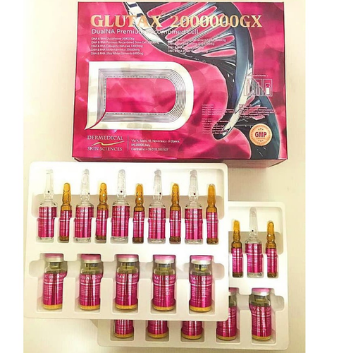 Introducing the enhanced Glutax 2000000gx Premium Recombined Cell: Now fortified with additional vitamins for superior skin restoration and faster results. This product is ideal for skin lightening, offering proven efficacy and improved formulation with added Anti-Aging elements.