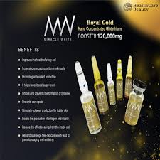 Miracle White Royal Gold 120000mg Glutathione Booster Injection brightens skin, reduces dark spots, and enhances skin texture. With a high dose of Glutathione, this skin brightening injection promotes a radiant complexion, fights free radicals, and supports collagen production, ensuring a glowing, youthful appearance.